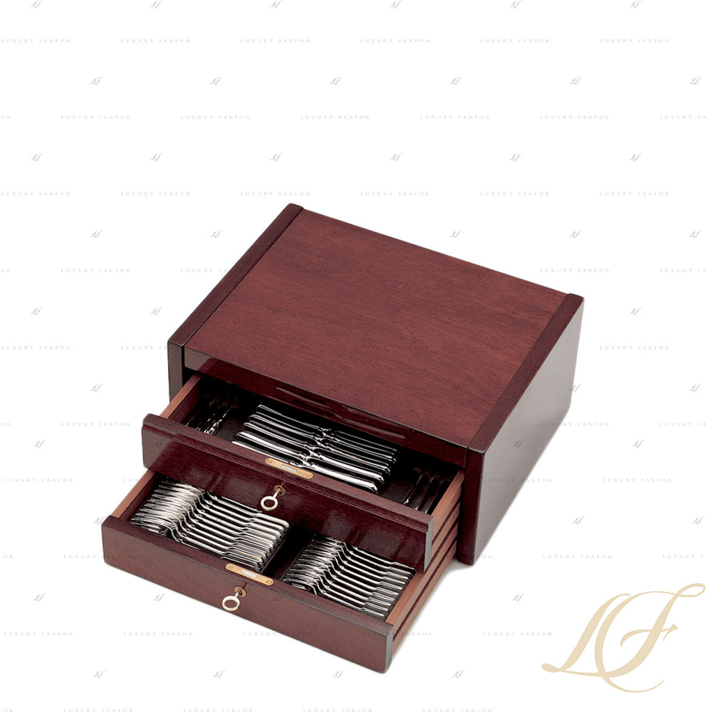 Подходит для следующего набора: по 12 шт. обеденных ложек, вилок, ножей, чайных ложек, вилок для пирожных и по 1 шт. ложек для овощей, вилок для овощей, ложек для сливок, больших сервировочных ложек, ложек для соуса, лопаток для торта, ложечек для сахара, а также 2 большие вилки для мяса