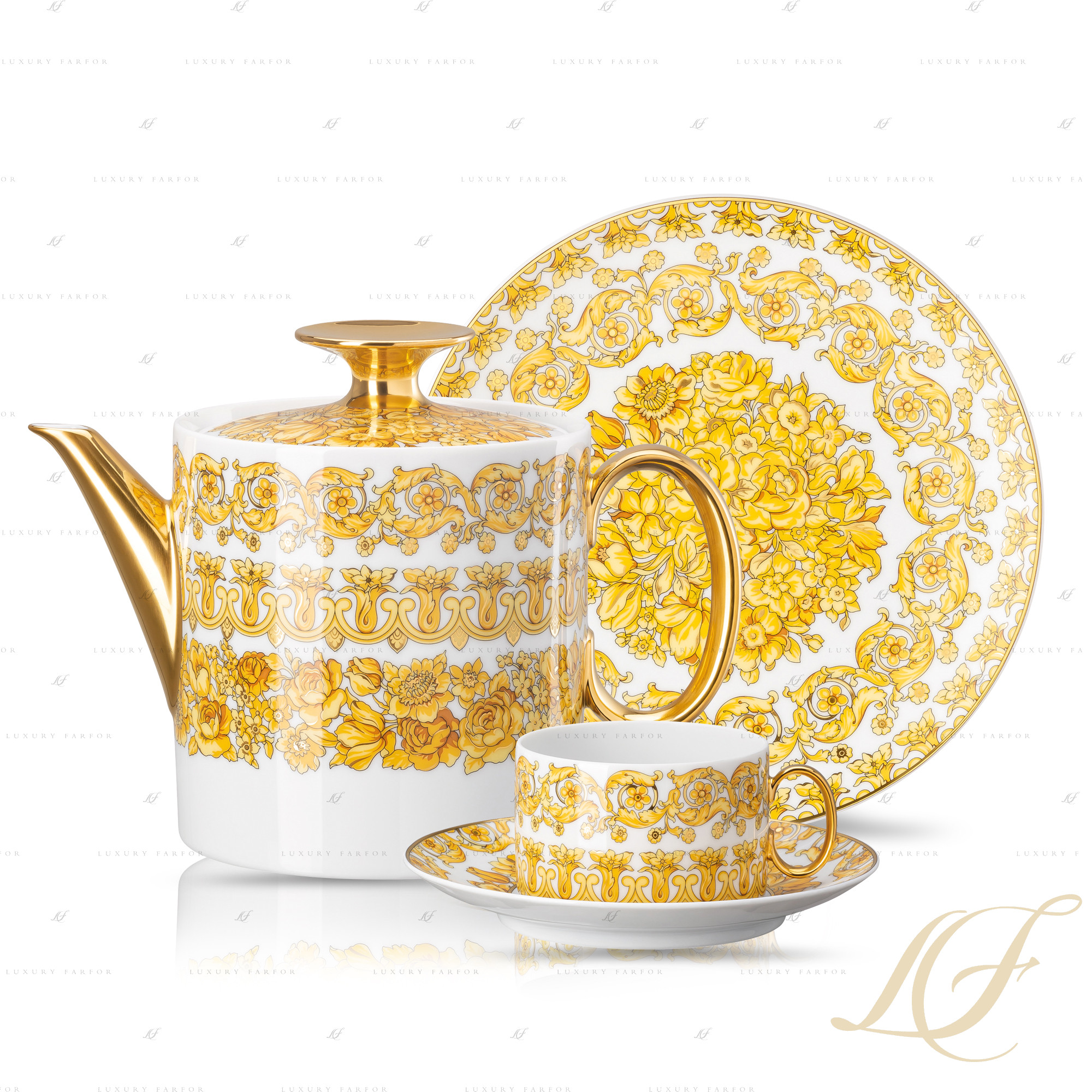 Розенталь Версаче: Медуза Рапсоди Чайный сервиз на 6 персон, 21 предмет 6х Тарелка Закусочная 21см 6x Чашка кофейная с блюдцем 0,23л 1x Кофейник 1,20л 1x Сахарница 0,23л 1x Молочник 0,18л