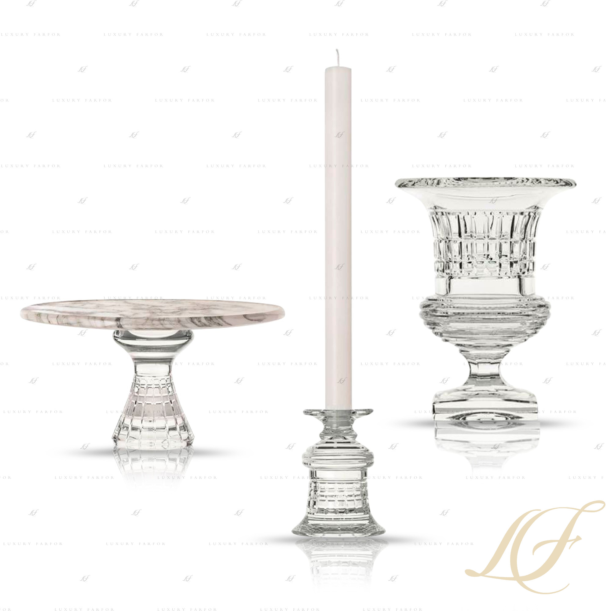 Серия аксессуаров Quadrille создана французским дизайнером Матье Бассе специально для бренда St. Louis. Эта линейка стала новым прочтением знаменитой коллекции Versailles, созданной дизайнером ранее и вдохновленной красотой знаменитой резиденции французских королей. На смену яркому цветному хрусталю пришли прозрачные изделия, в сложной огранке которых красиво преломляется свет. Помимо подсвечников и ваз, в линейку "Кадриль" вошли хрустальные столики-пьедесталы, чьи столешницы выполнены из настоящего каррарского мрамора – цвет камня вы можете выбрать на свой вкус из трех вариантов.