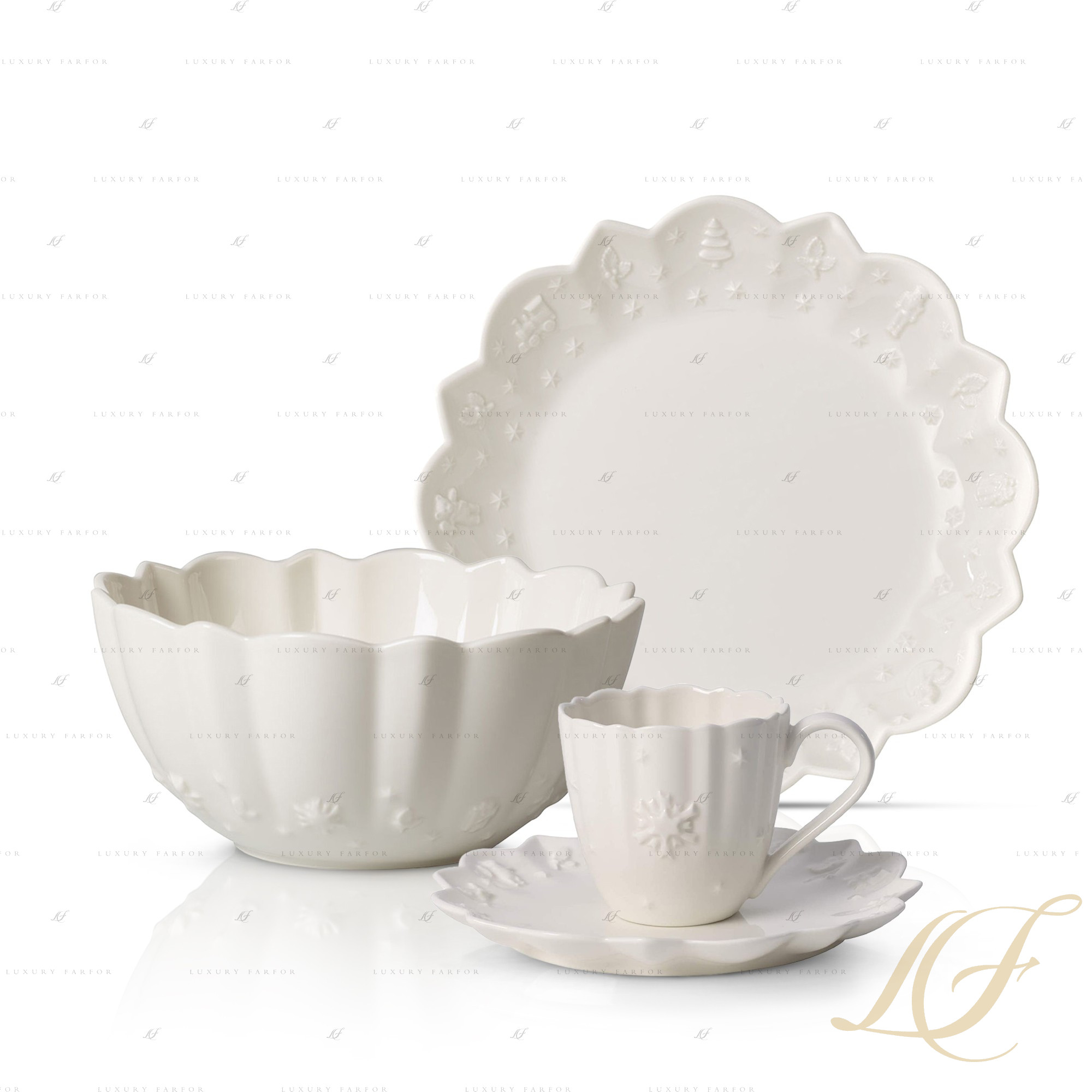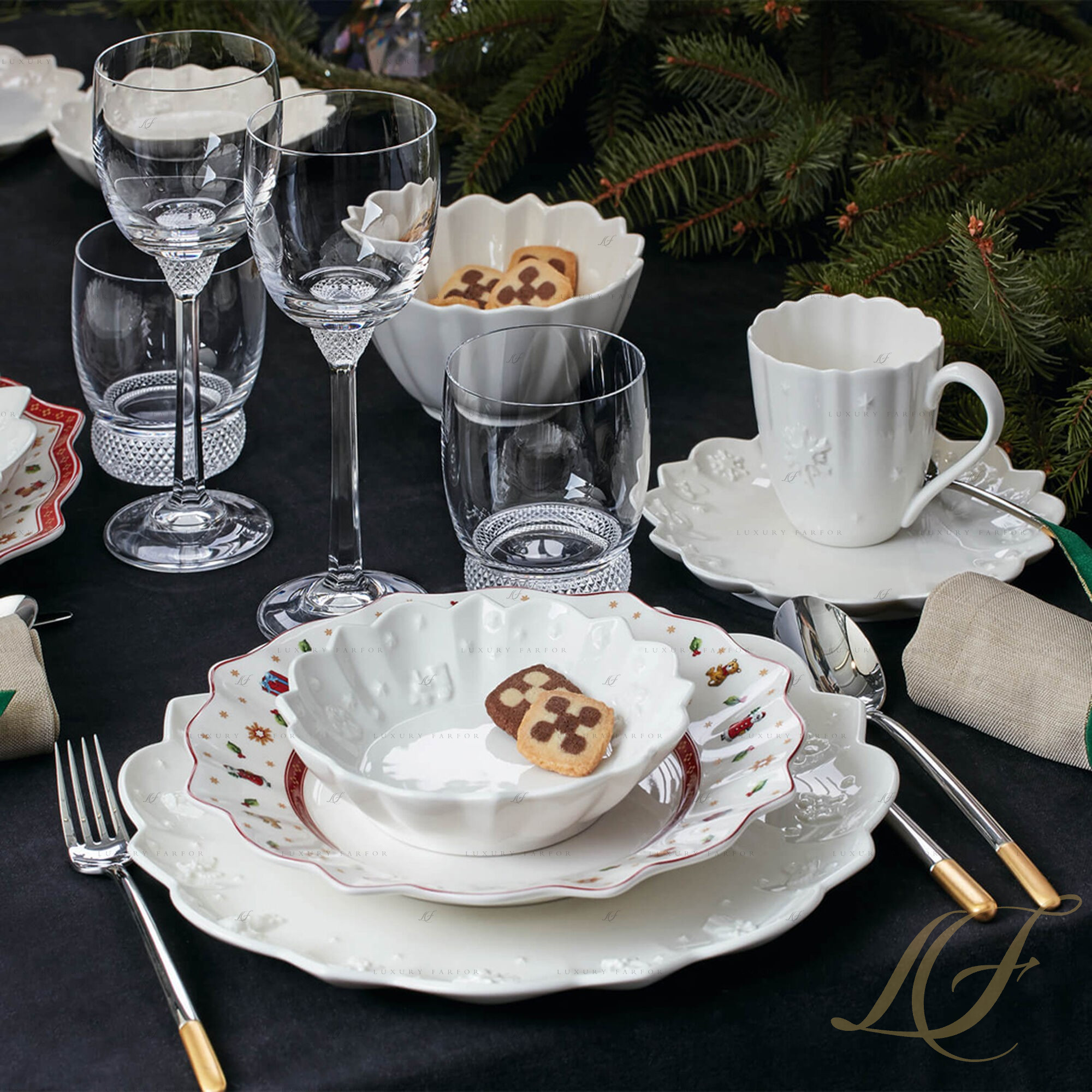 Toy‘s Delight Royal – рождественская коллекция столовой посуды от торговой марки Villeroy & Boch, ставшая продолжением большой праздничной линейки Toy‘s Delight. Ослепительно белая фарфоровая посуда украшена роскошным рельефным декором, напоминающим изящную гипсовую лепнину. Очаровательные сапожки, елочки, пряничные человечки и другие объемные фигурки, будто позаимствованные у рождественской елки, расположились по кругу тарелок, блюд, чаш и другой посуды из этого сервиза. Ребристая форма предметов в сочетании с эффектным резным краем подчеркивают праздничное настроение коллекции Toy‘s Delight Royal.